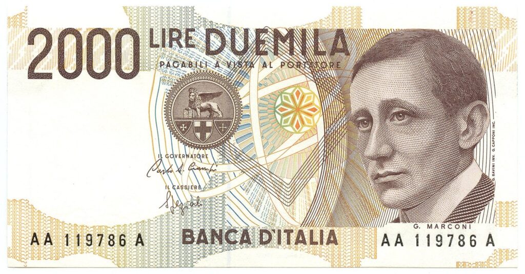La 2000 lire “Marconi” fu emessa dalla Banca d’Italia nel 1990 e rimase in circolazione fino al passaggio all’euro (2002). Era caratterizzata da un design moderno per l’epoca, con colori pastello e una forte attenzione alla sicurezza.